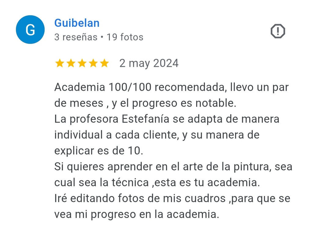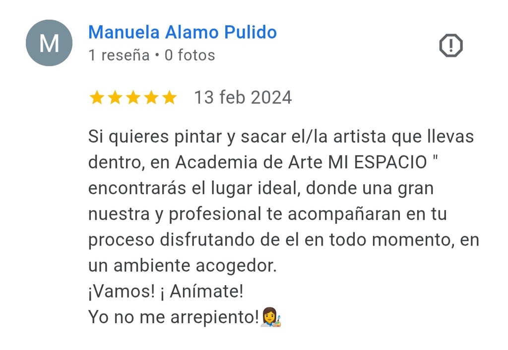 La academia de Arte “MI ESPACIO” lleva una línea de enseñanza orientada a todas las personas que estén interesadas en el arte y desarrollo de las capacidades artísticas. En esta academia podrás aprender todo sobre el dibujo, las distintas técnicas artísticas, el volumen, la composición y la creatividad. PARA NIÑOS Y ADULTOS. Tendrás a tu disposición un espacio de 100 m2 totalmente adaptado y con un ambiente inmejorable. Contarás con una taquilla personal donde podrás dejar todo tu material de forma permanente y caballete para crear tus preciosas obras de arte.